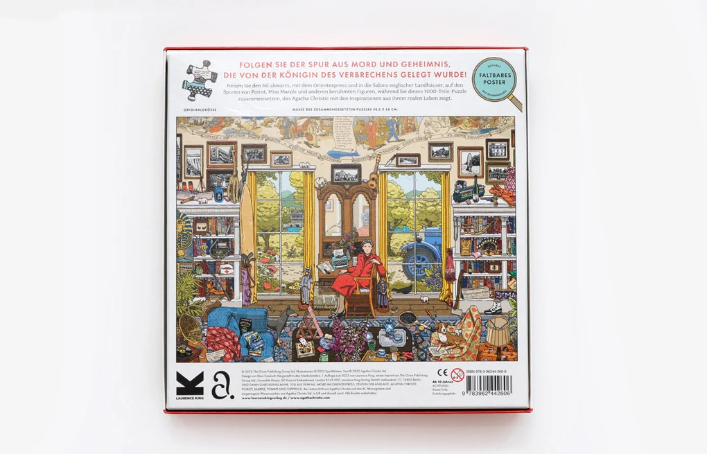 Begib dich auf eine Reise voller Mysterien und Intrigen, die von der Königin des Krimis selbst gesponnen wurde! Mit diesem 1000-Teile-Puzzle folgst du den Spuren von Poirot, Miss Marple und anderen ikonischen Figuren durch die schillernden Welten von Agatha Christie. Reise den Nil hinab, fahre mit dem Orientexpress nach Calais oder tauche ein in die eleganten Salons englischer Landhäuser. Während du das Puzzle zusammensetzt, wirst du von den Schauplätzen und Inspirationen aus Christies realem Leben umgeben sein. Ein beiliegendes Poster hilft dir dabei, alle abgebildeten Gegenstände aus ihrem Leben und ihren berühmten Romanen zu identifizieren und enthüllt die Geschichten dahinter.