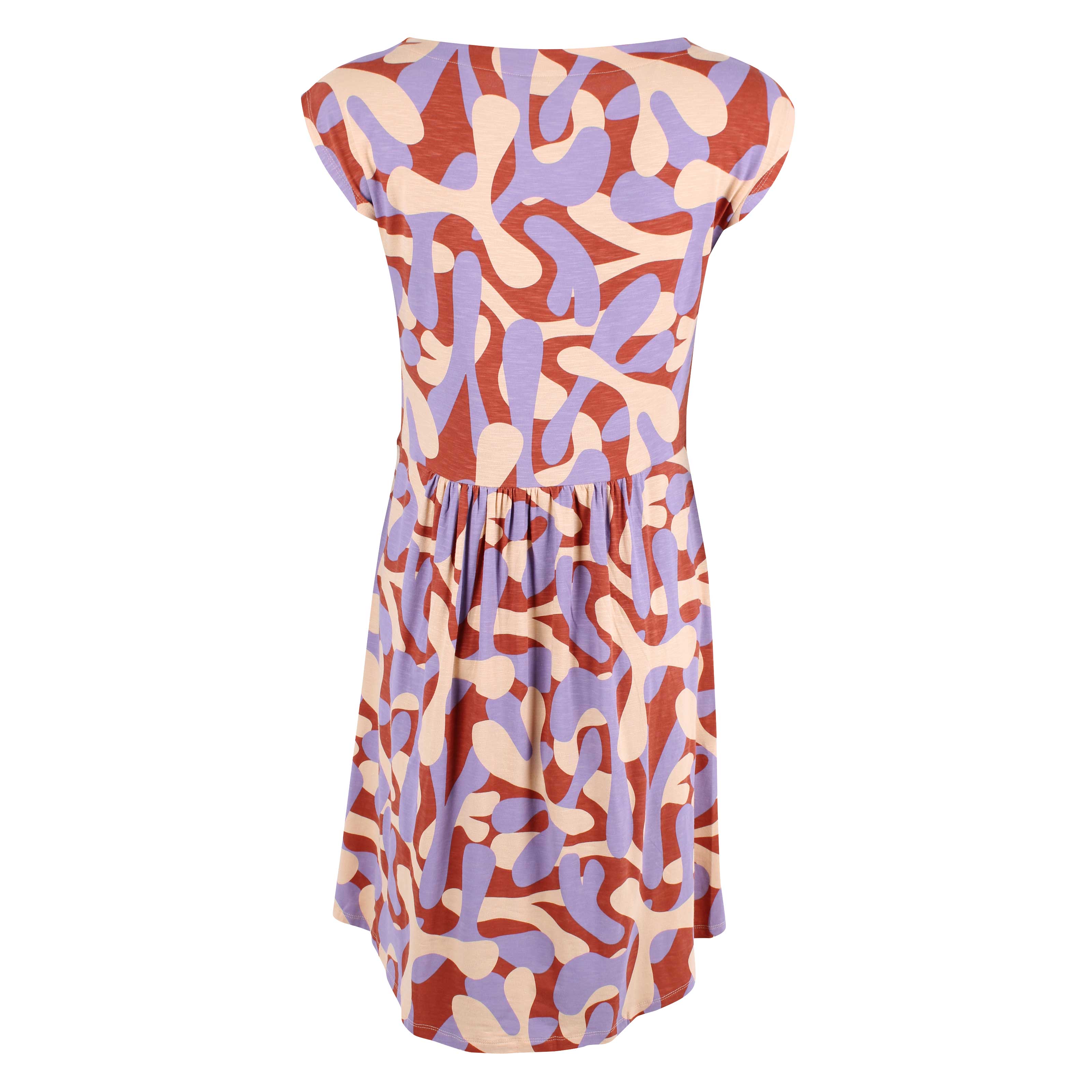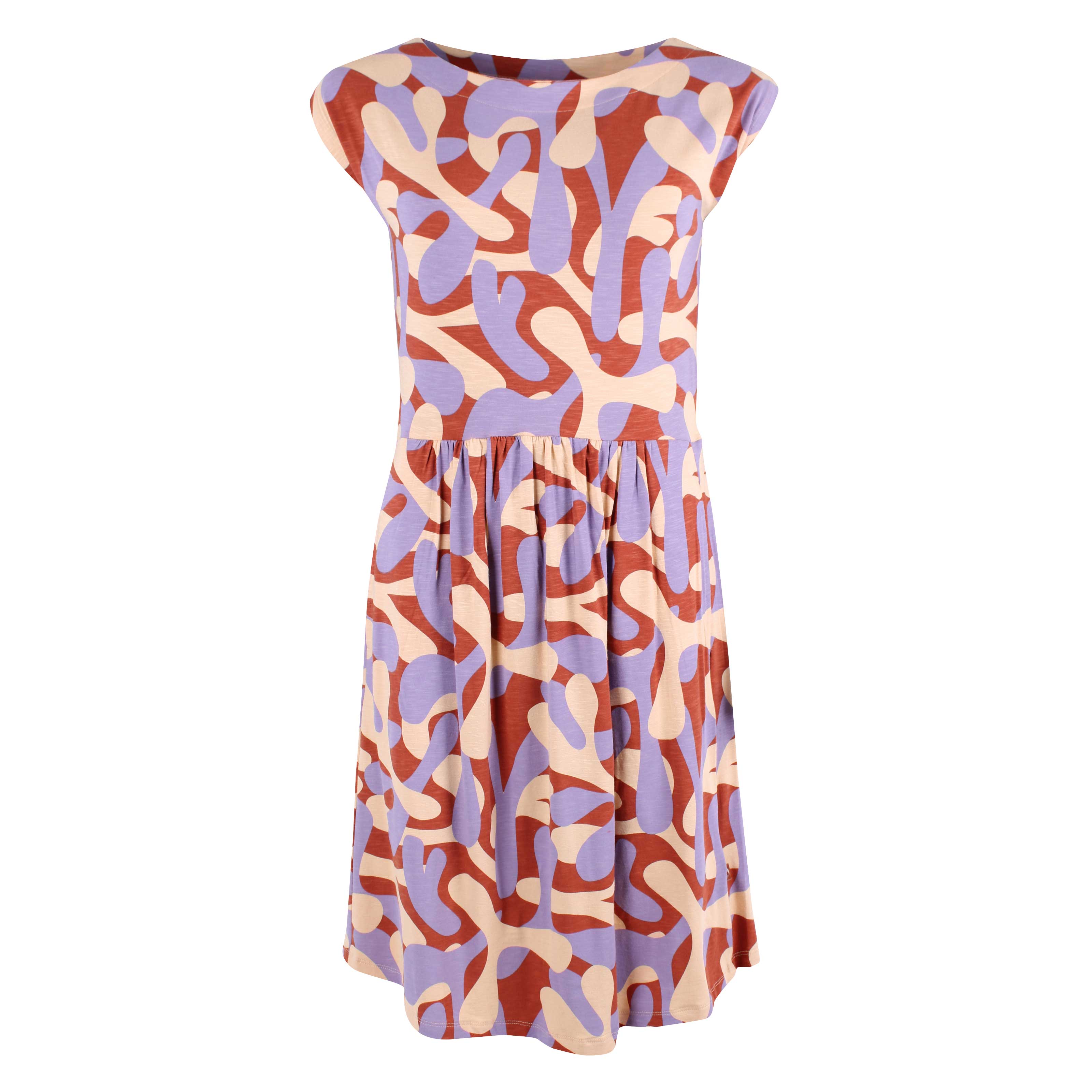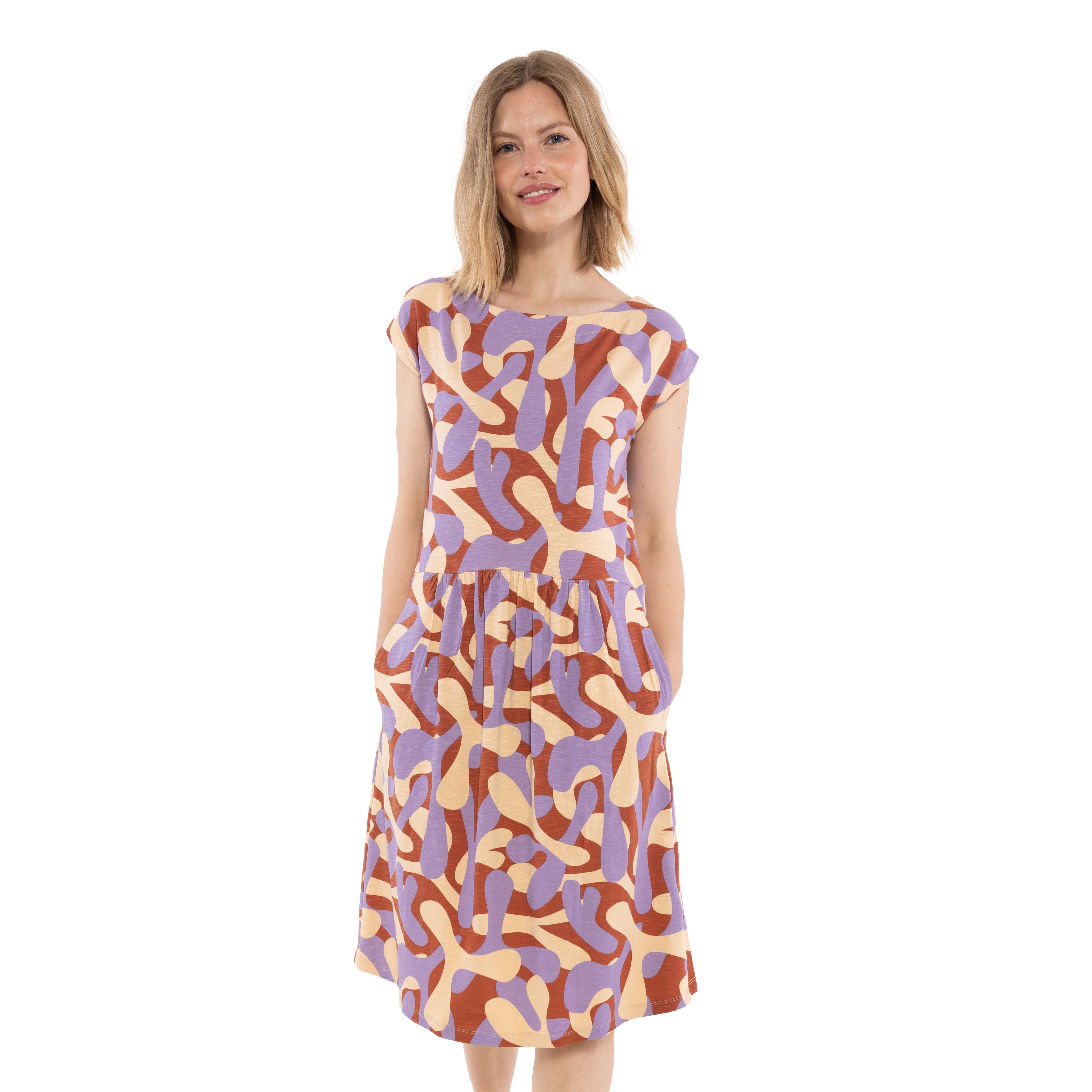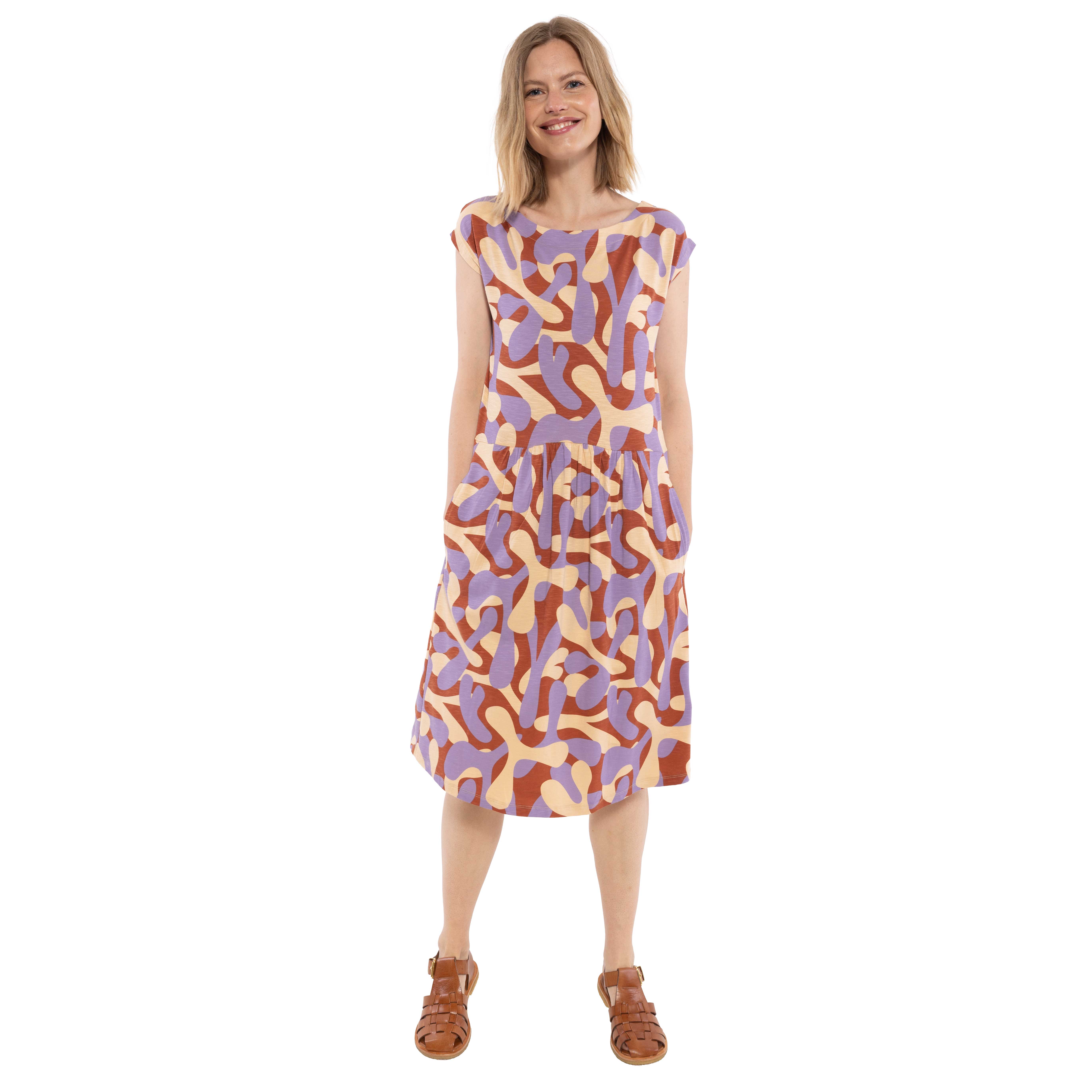 Der lockere Schnitt fällt besonders schön und wird durch eine dezente Taillennaht ergänzt, die die Silhouette sanft betont. Kurze Ärmel und ein breiter Halsausschnitt verleihen dem Kleid einen modernen, luftigen Look. Praktische Seitentaschen runden das Design funktional ab und machen das Kleid alltagstauglich.