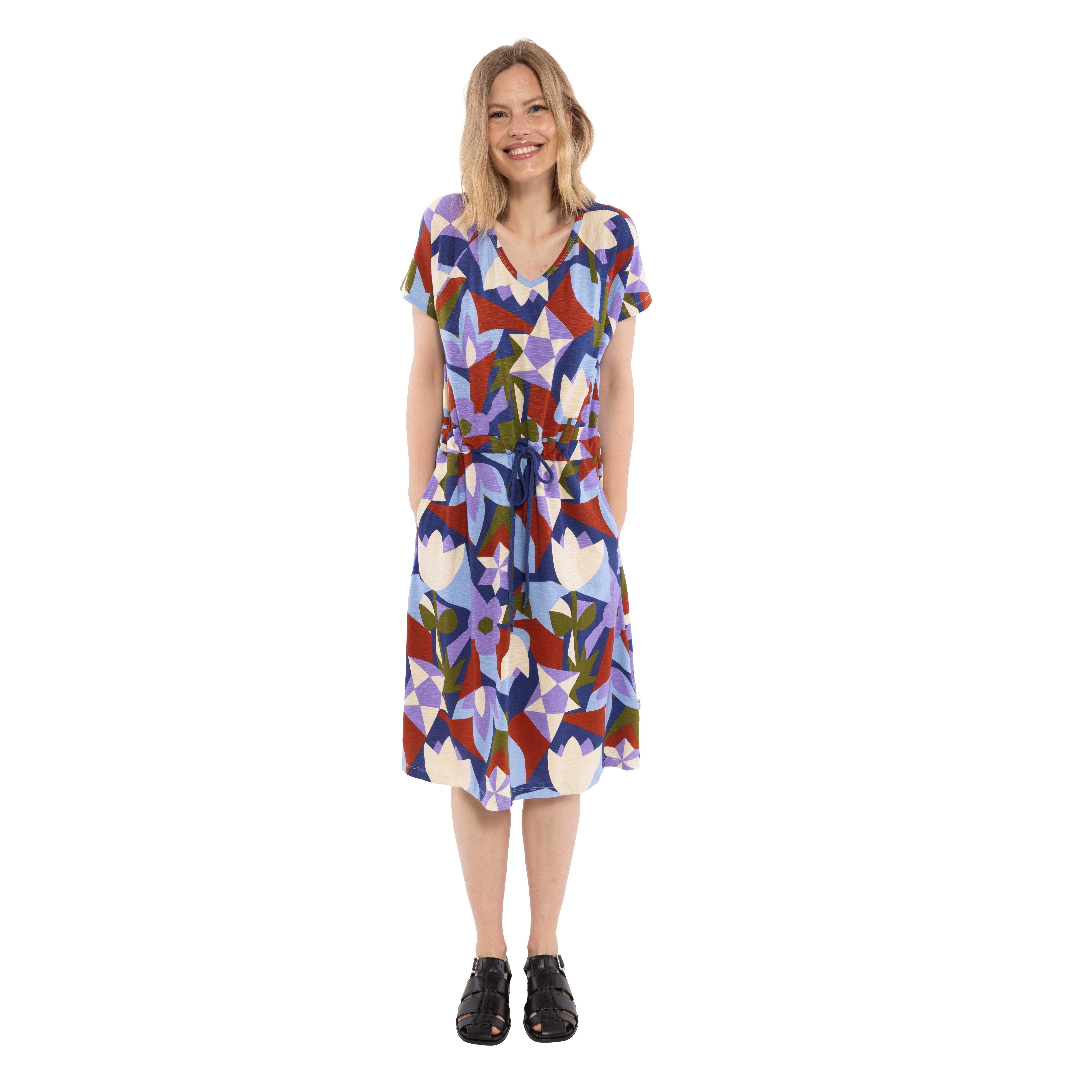 Dank der verstellbaren Taille mit Bindeband lässt sich die Passform individuell anpassen und betont auf Wunsch die Figur. Der elegante V-Ausschnitt verleiht dem Kleid eine stilvolle Note, während das florale Muster in warmem Blau und zartem Lila für einen frischen, modernen Look sorgt.
