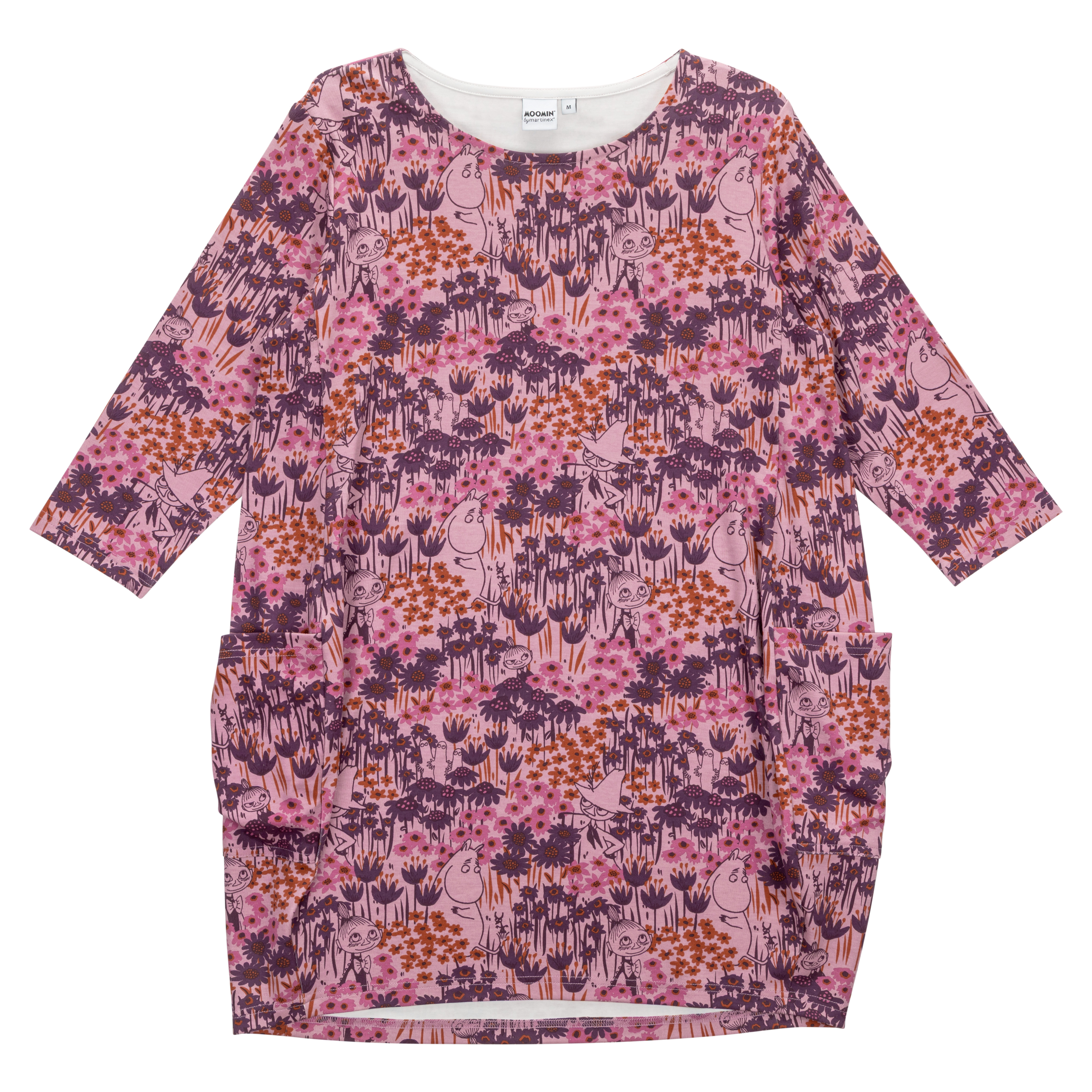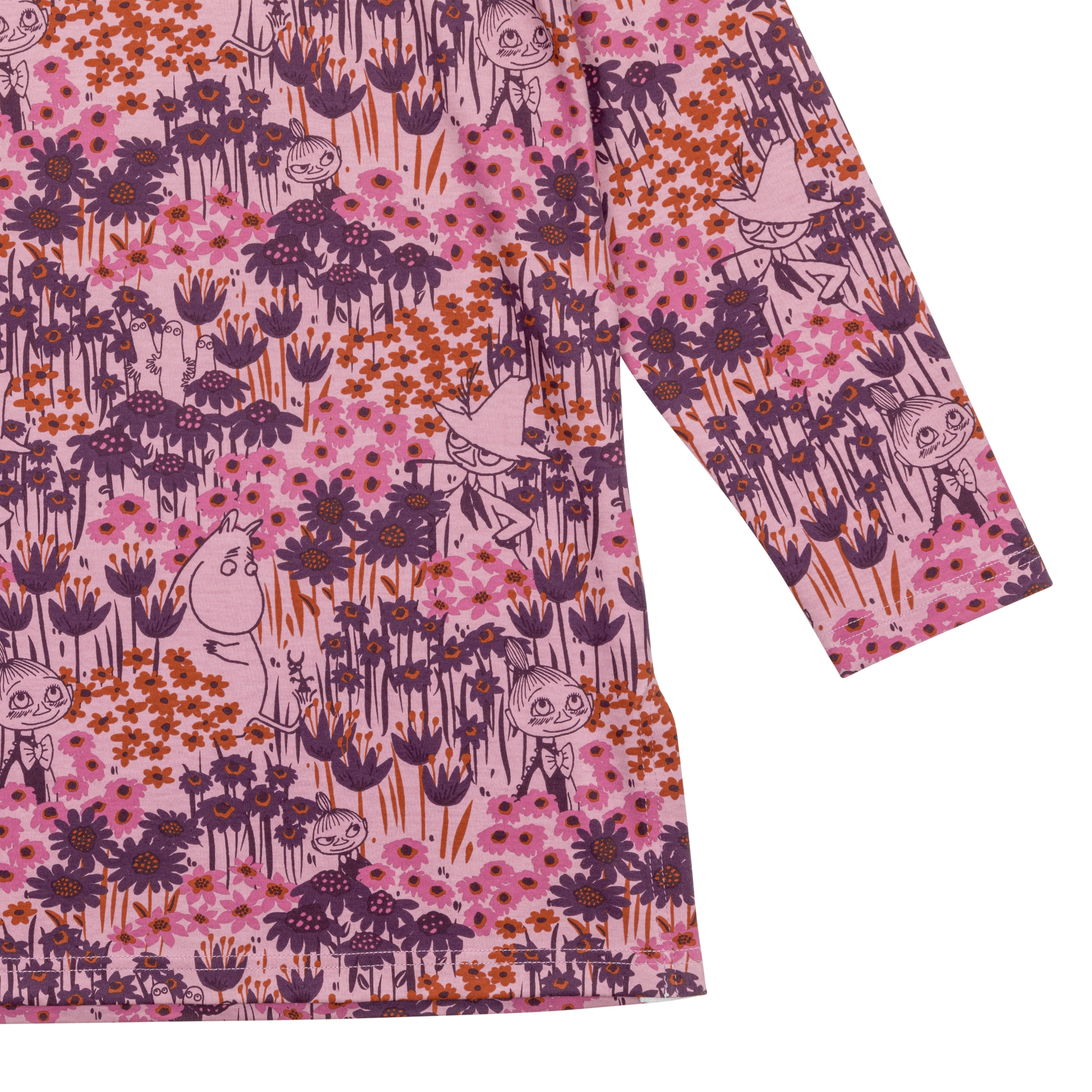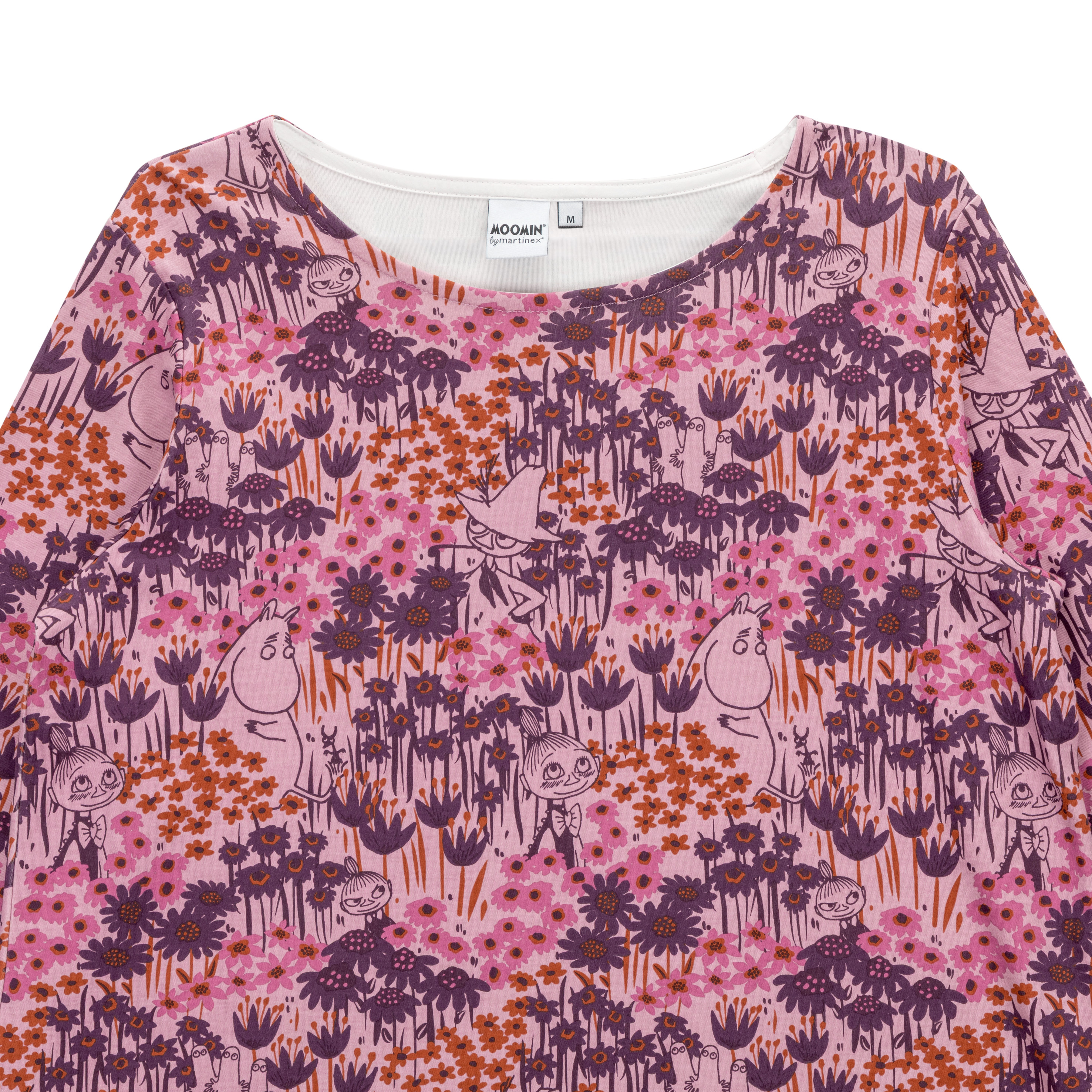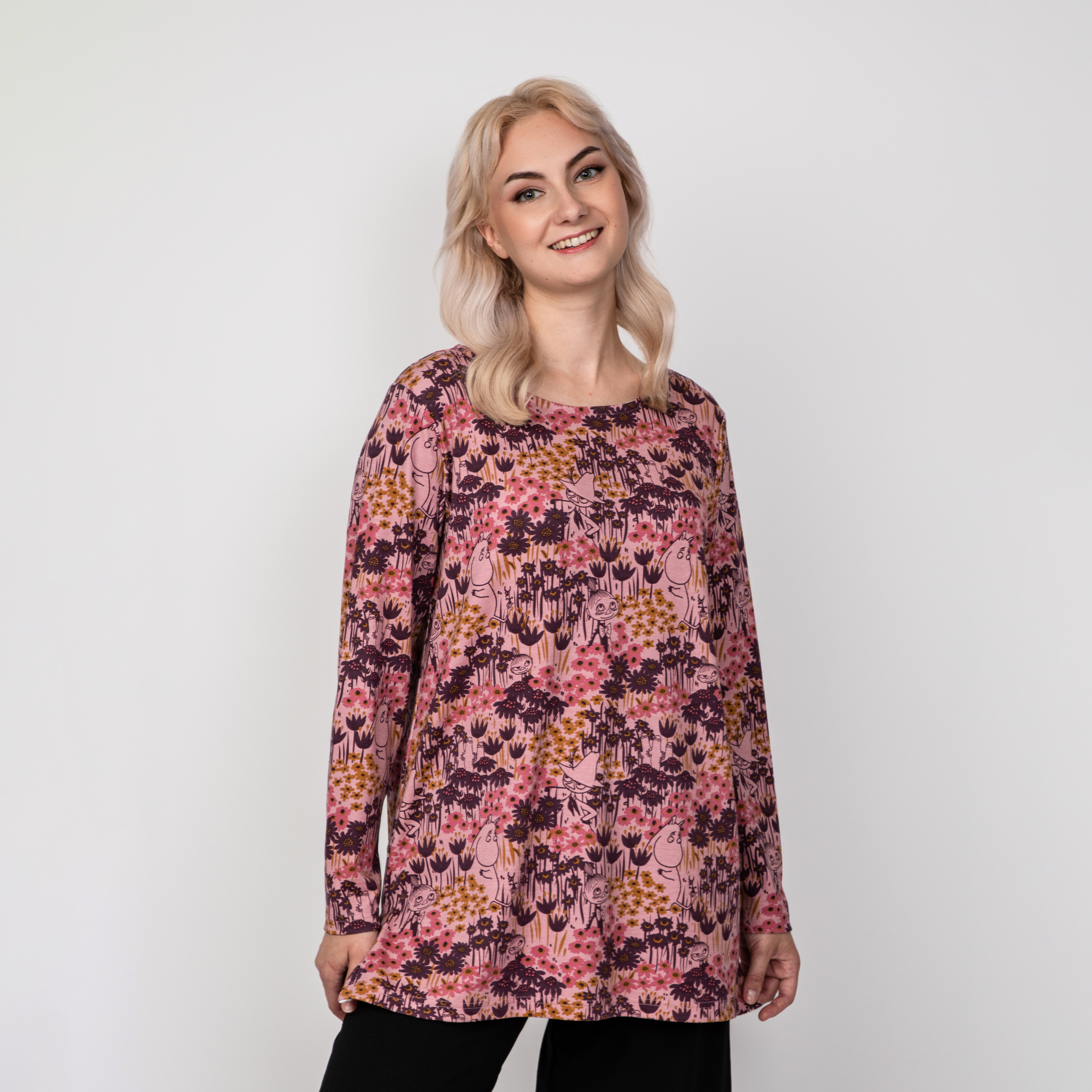 Diese roséfarbene Tunika aus der Moomin-Kollektion für Damen lädt zum Träumen ein. Auf dem Print spazieren Mumintroll, Snufkin und Mymble durch eine riesige Blumenwiese – ein kleiner Ausflug in die Moominwelt für jeden Tag.
