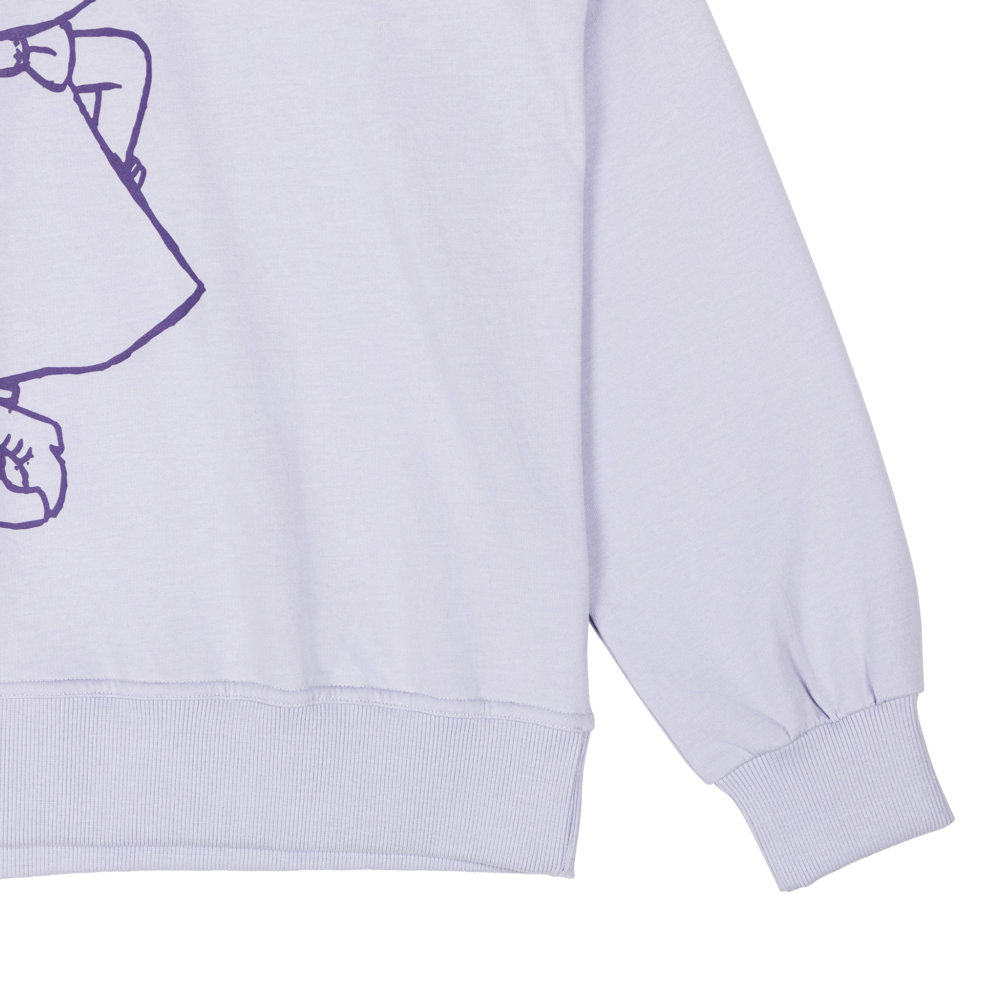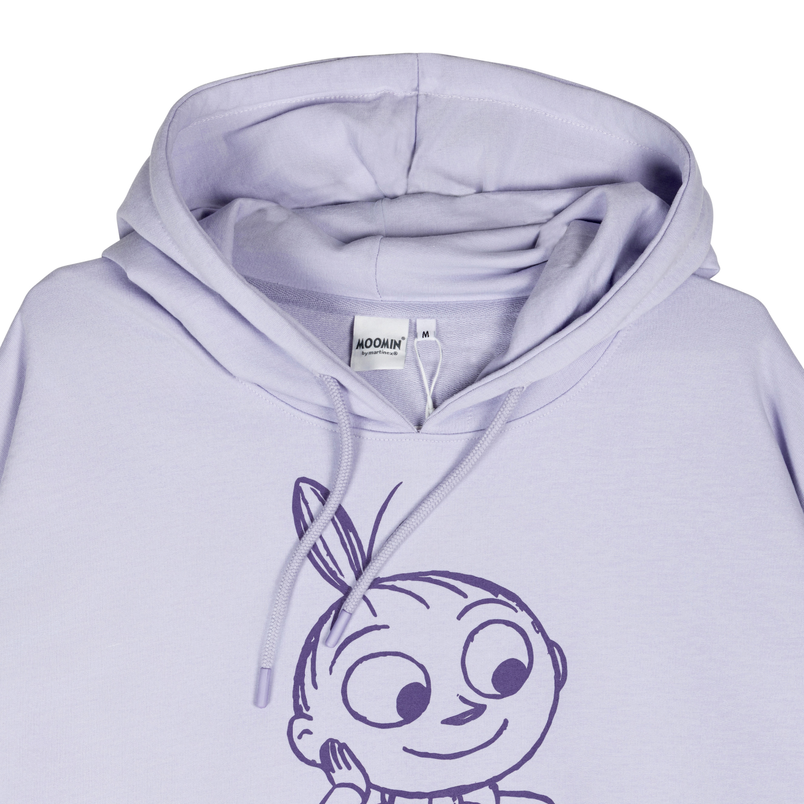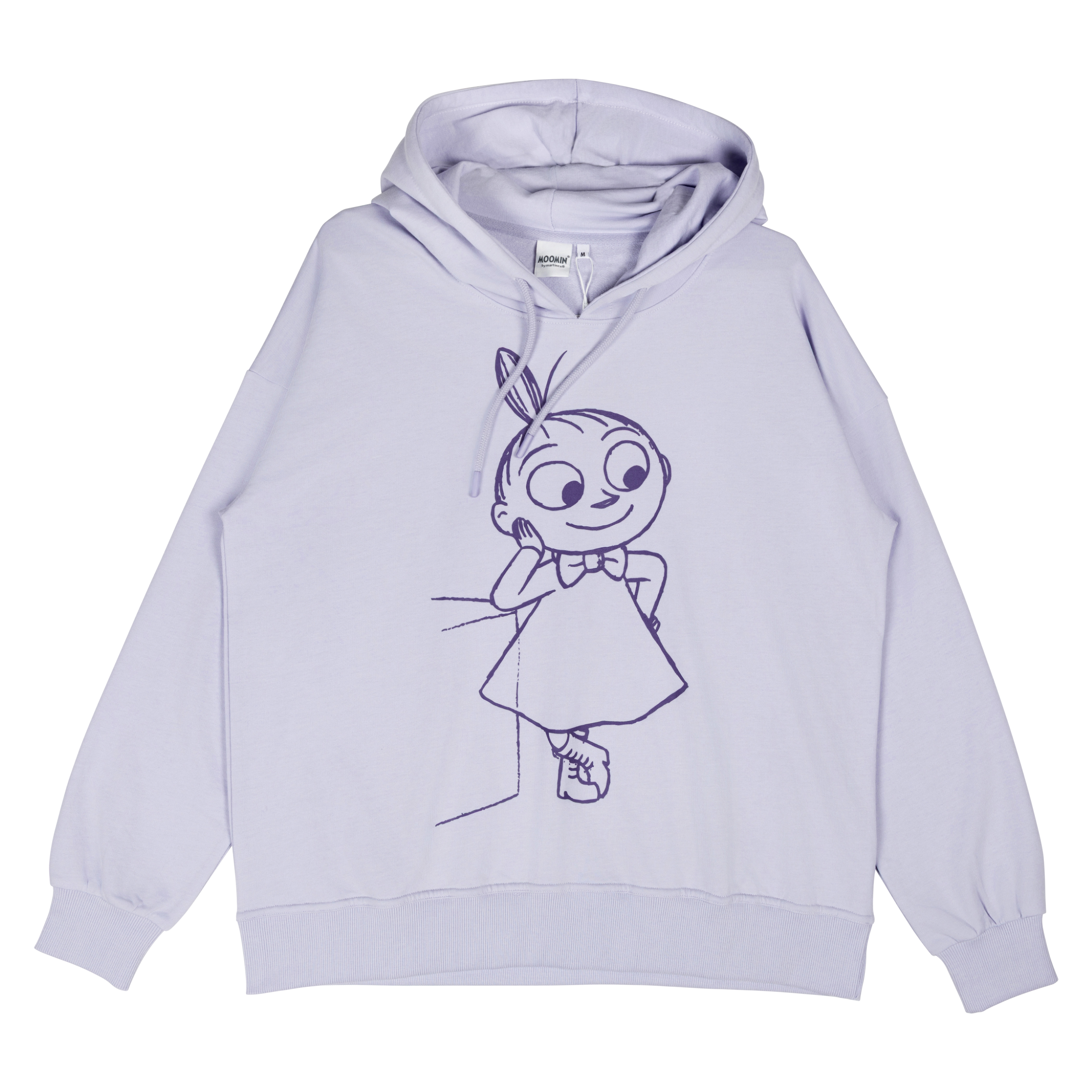 Bequemer Hoodie in Lila aus der beliebten Moomin-Kollektion. Der Sweater hat eine lockere, lange Passform mit überschnittener Schulter und gefütterter Kapuze samt Kordelzug. Auf der Brust zeigt sich ein zarter Little-My-Sketch – frech, charmant und ganz typisch für sie.