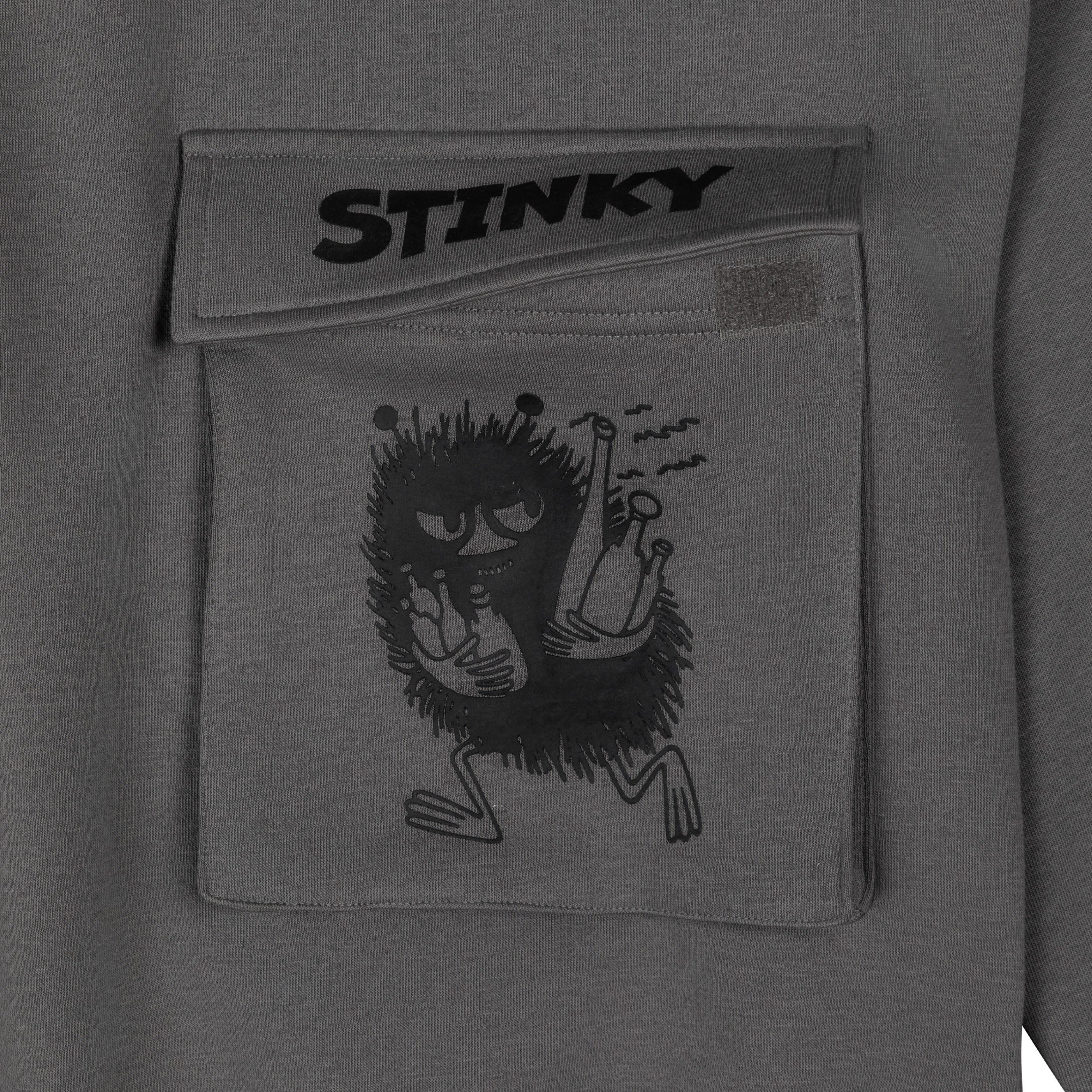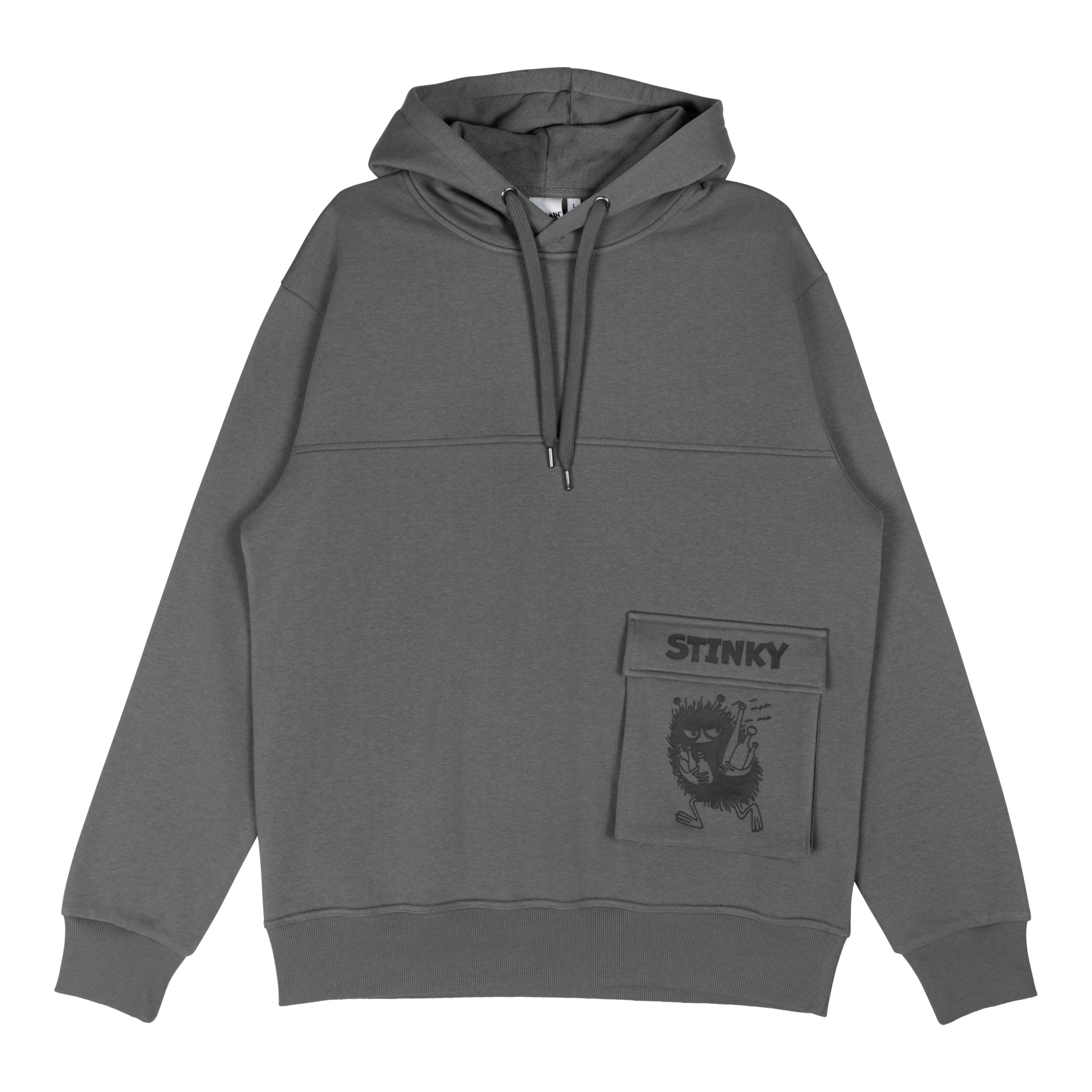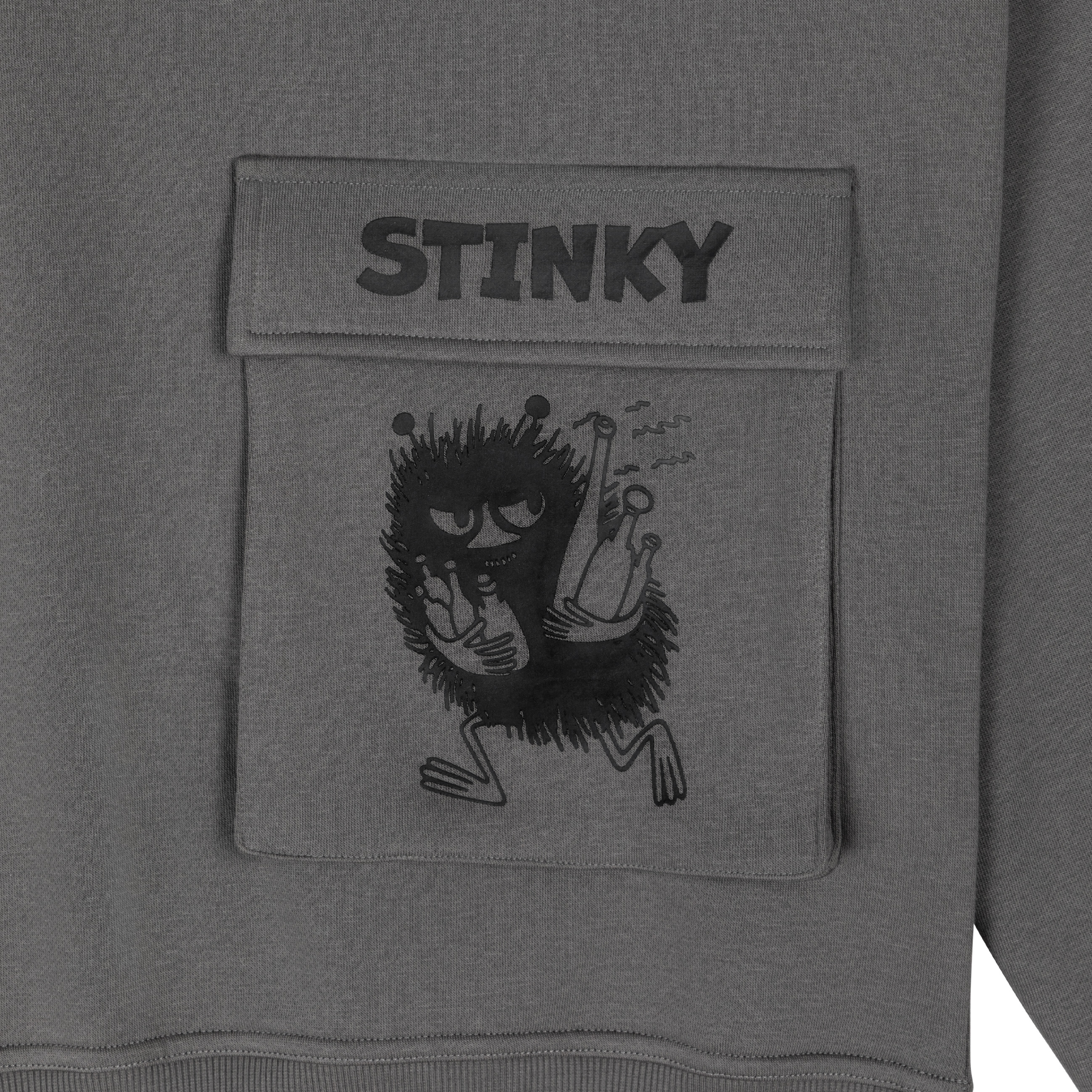 Dunkelgrauer Unisex-Hoodie aus der Moomin-Kollektion mit gemütlicher Kapuze und langen Ärmeln. Auf der Vorderseite sorgt eine witzige Klappentasche mit Stinky-Print für gute Laune – perfekt für alle, die den frechen Moomin-Charakter lieben.