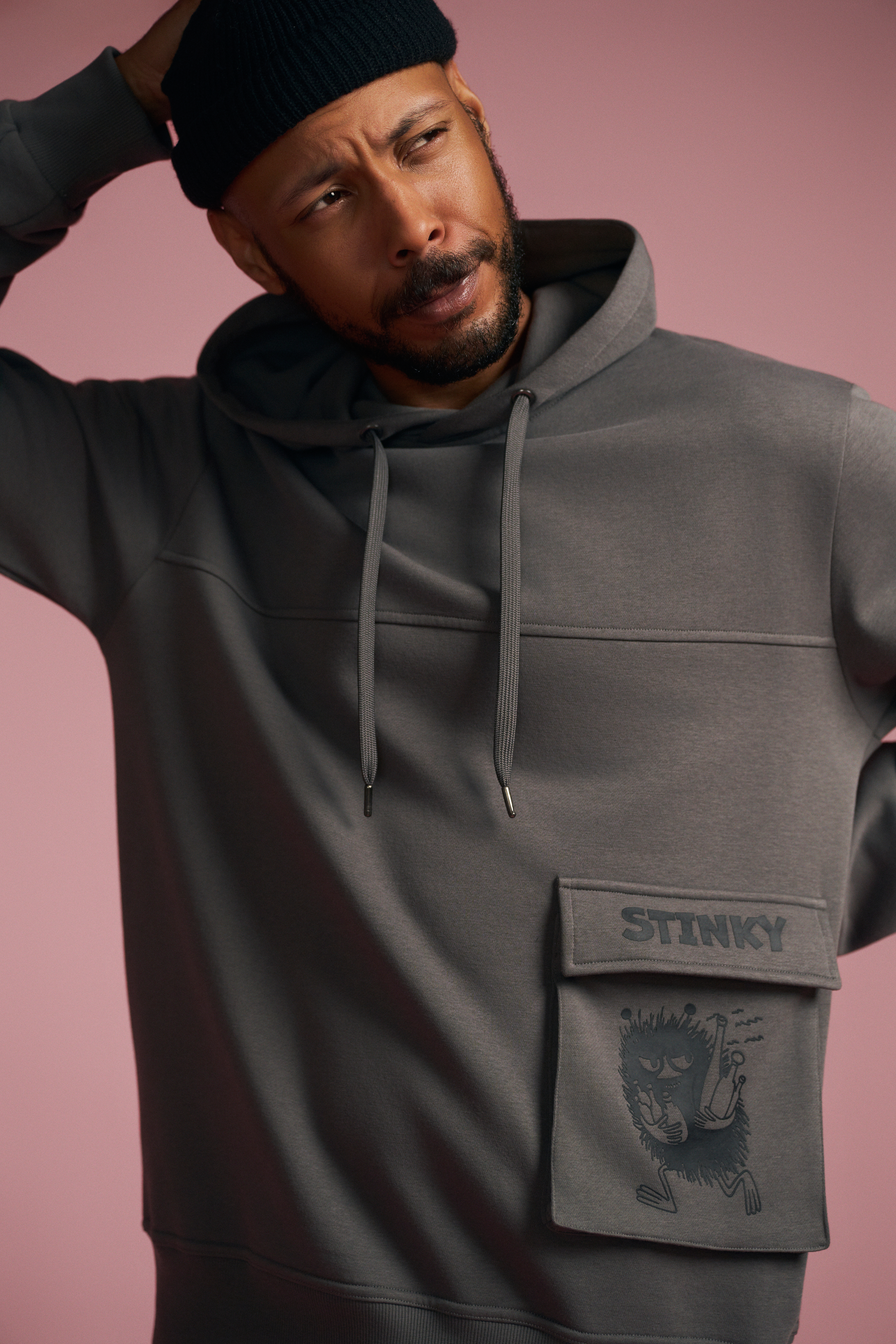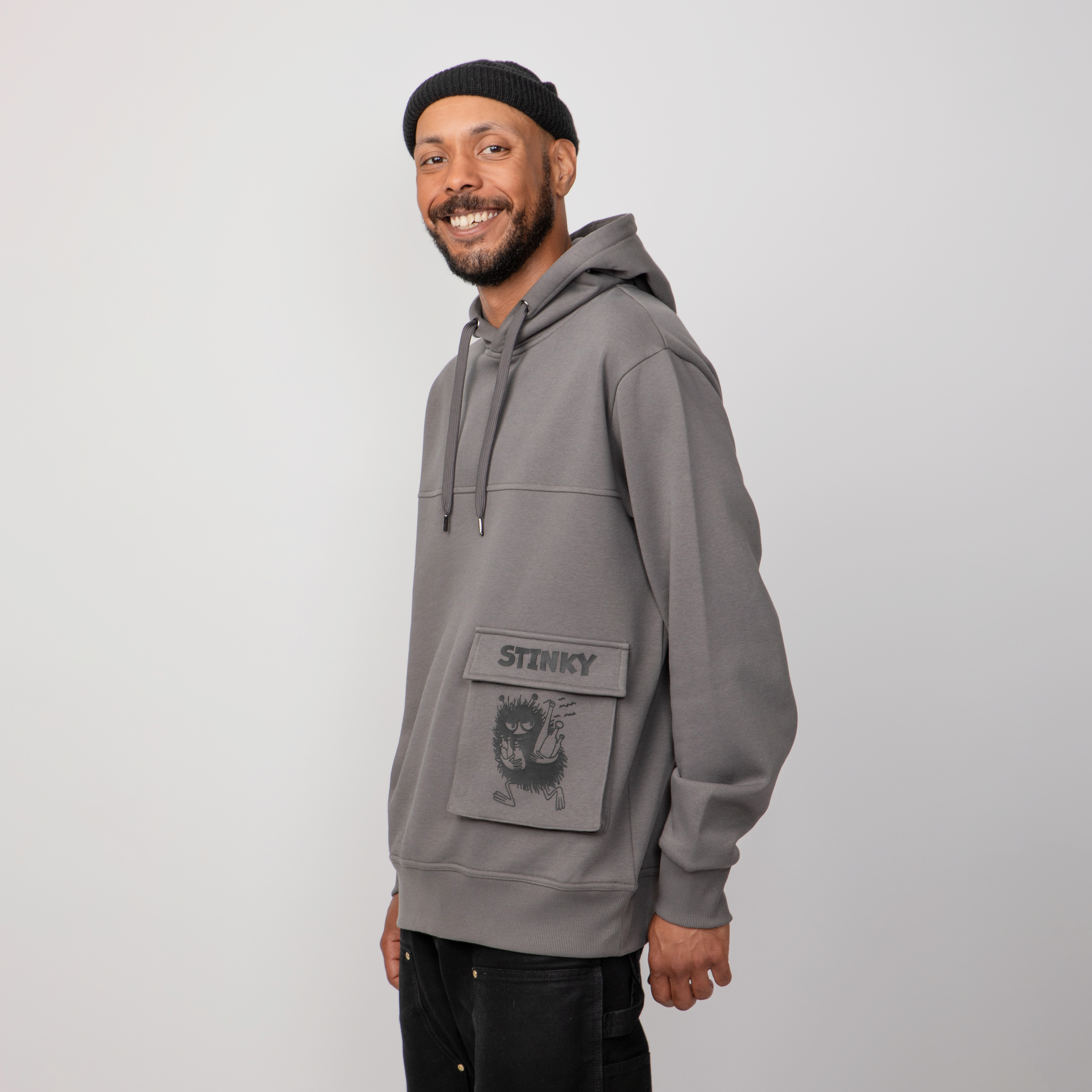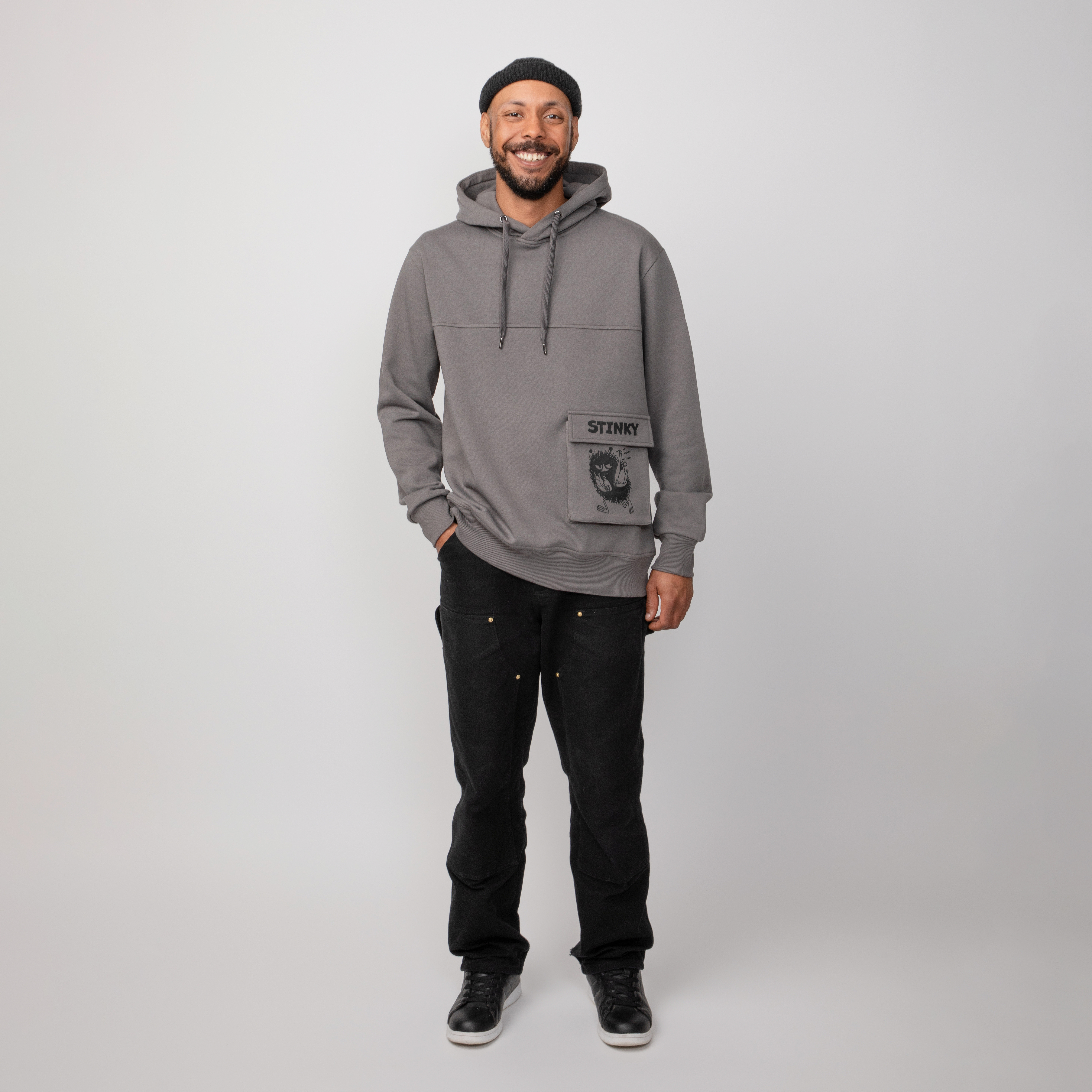 Dunkelgrauer Unisex-Hoodie aus der Moomin-Kollektion mit gemütlicher Kapuze und langen Ärmeln. Auf der Vorderseite sorgt eine witzige Klappentasche mit Stinky-Print für gute Laune – perfekt für alle, die den frechen Moomin-Charakter lieben.