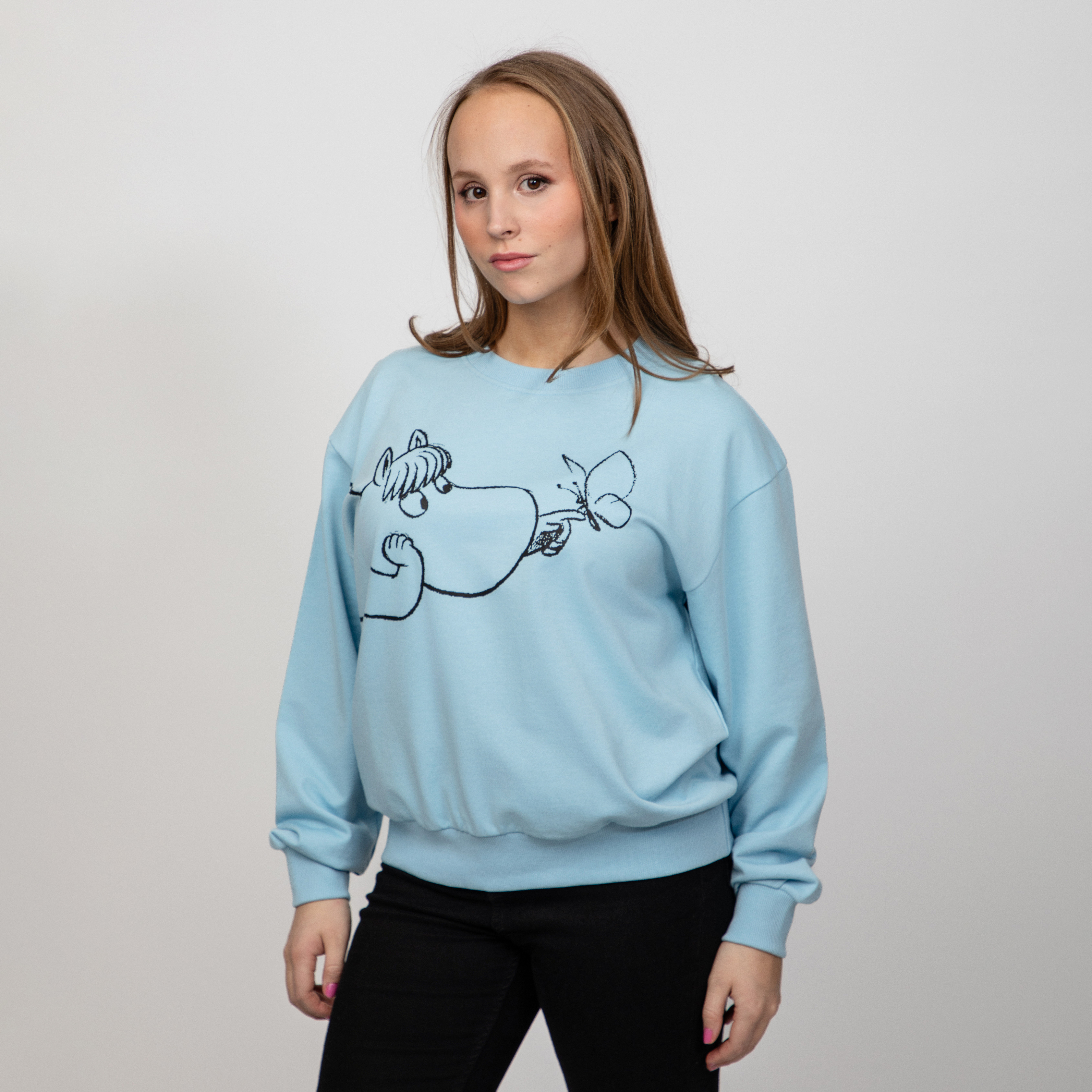 Dieses lässige Damen-Sweatshirt bringt Moomin-Charme in deinen Alltag. Der lockere Schnitt, lange Ärmel und der klassische Rundhalsausschnitt sorgen für entspannten Tragekomfort. Auf der Vorderseite begeistert ein verspielter Print mit Snorkfräulein und einem Schmetterling. Gefertigt aus weichem French-Terry-Baumwollstoff mit Loopback-Innenseite – angenehm auf der Haut und perfekt für jeden Tag. Entworfen in Finnland.