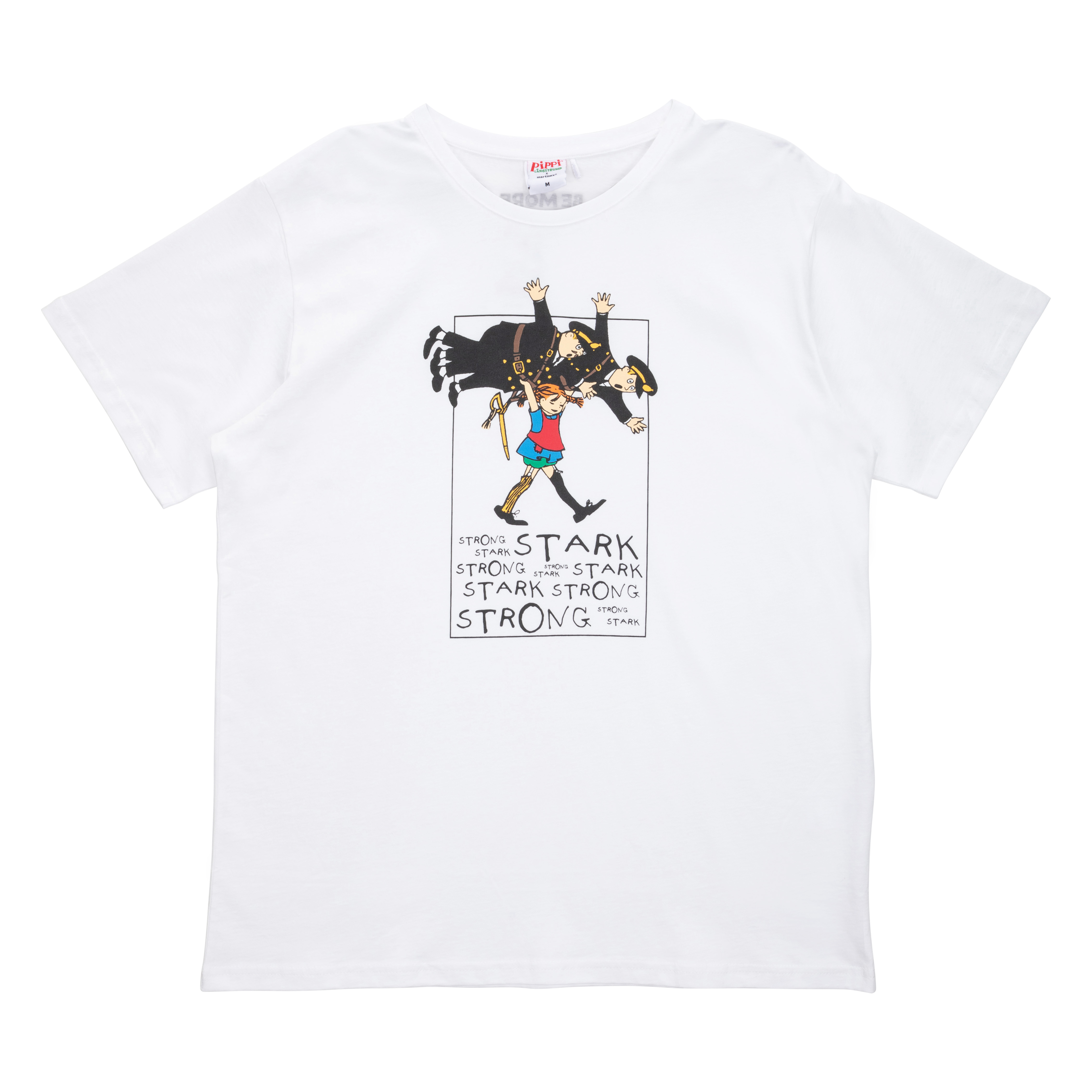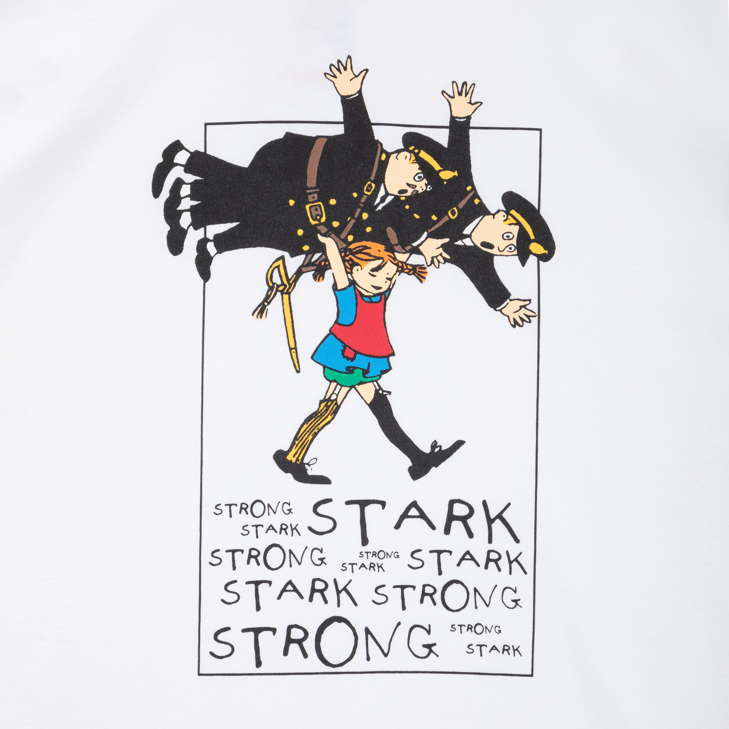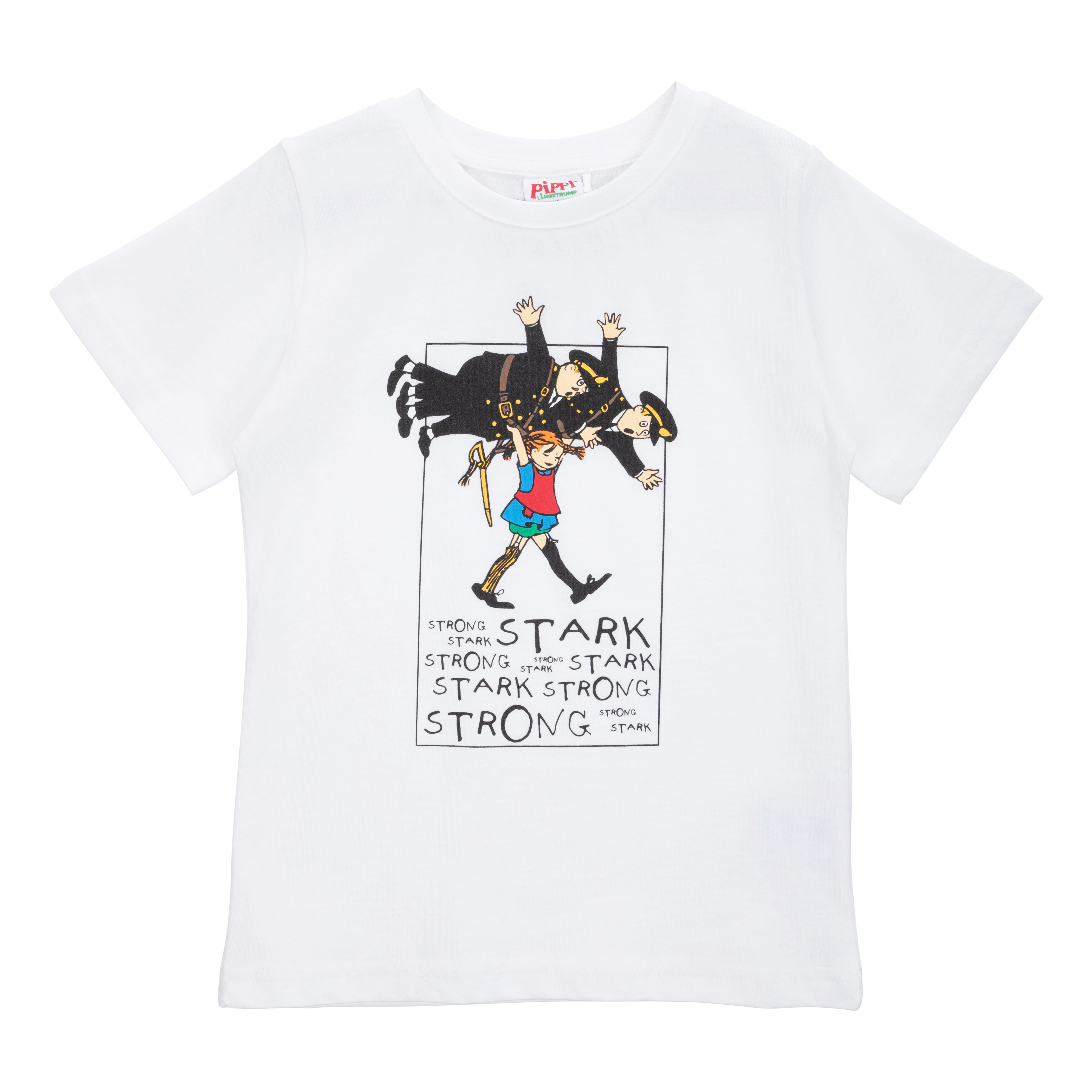 Dieses unisex T-Shirt in Naturweiß kommt mit geradem Schnitt und ist sowohl für Kinder als auch für Erwachsene erhältlich. Ein liebevolles Detail versteckt sich im Nacken: der Schriftzug „Be more Pippi“. Auf der Brust sorgt ein fröhlicher Print für gute Laune – Pippi Langstrumpf hebt zwei Polizisten mühelos über ihren Kopf, begleitet vom Wort „Strong“, mehrfach wiederholt auf Englisch und Schwedisch. Ganz klar: stärker geht’s kaum.