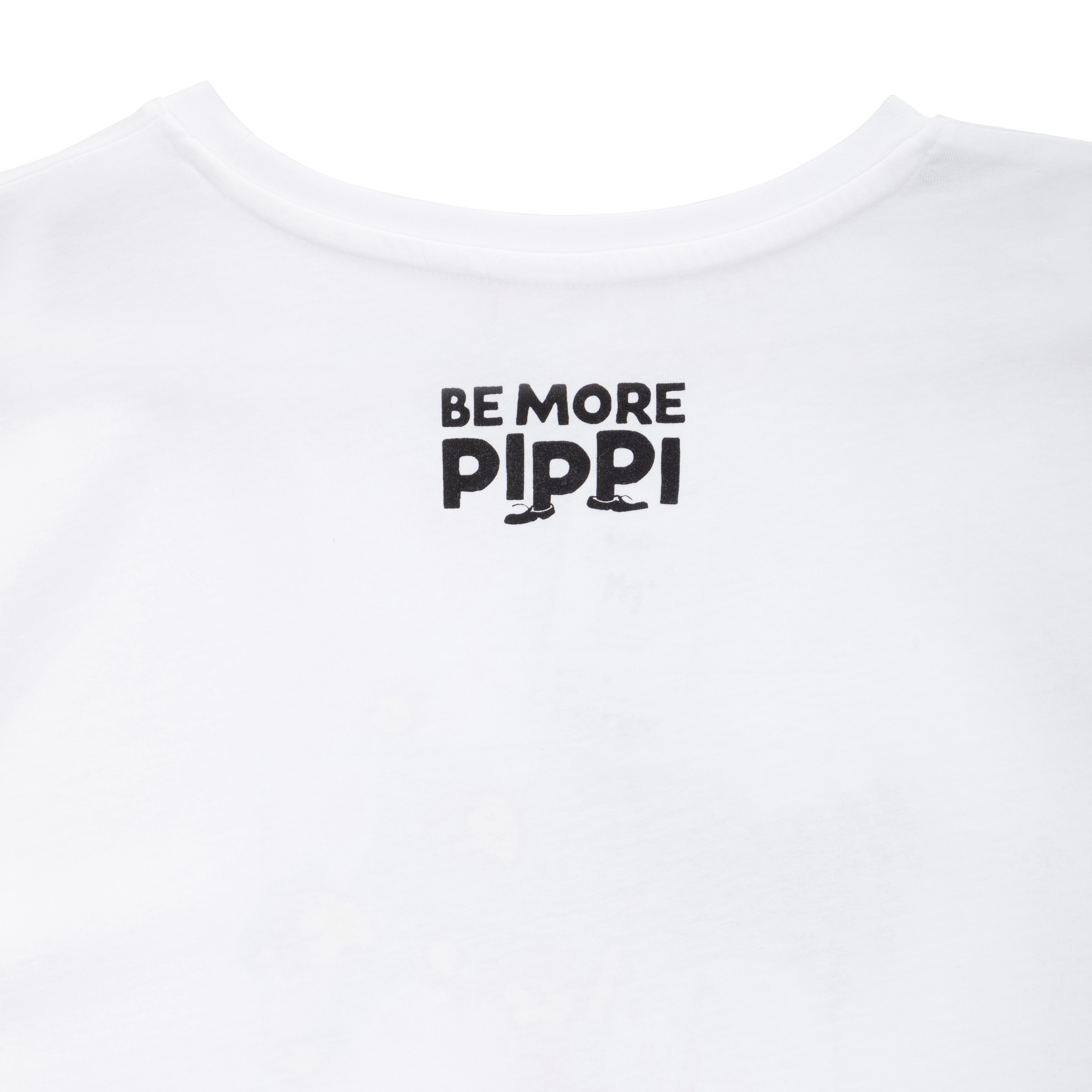 Im Mittelpunkt steht der liebevolle Brustprint: Pippi hält ihren treuen Affen Herrn Nilsson fest im Arm. Dazu erscheint das Wort „Kind“ mehrfach auf Englisch und Schwedisch – eine charmante Erinnerung daran, wie wichtig Freundlichkeit, Mitgefühl und Zusammenhalt sind. Ein dezenter Schriftzug „Be more Pippi“ im Nacken unterstreicht die Botschaft zusätzlich. Abgerundet wird das Design durch ein weißes Pippi-Label als feines Detail.
