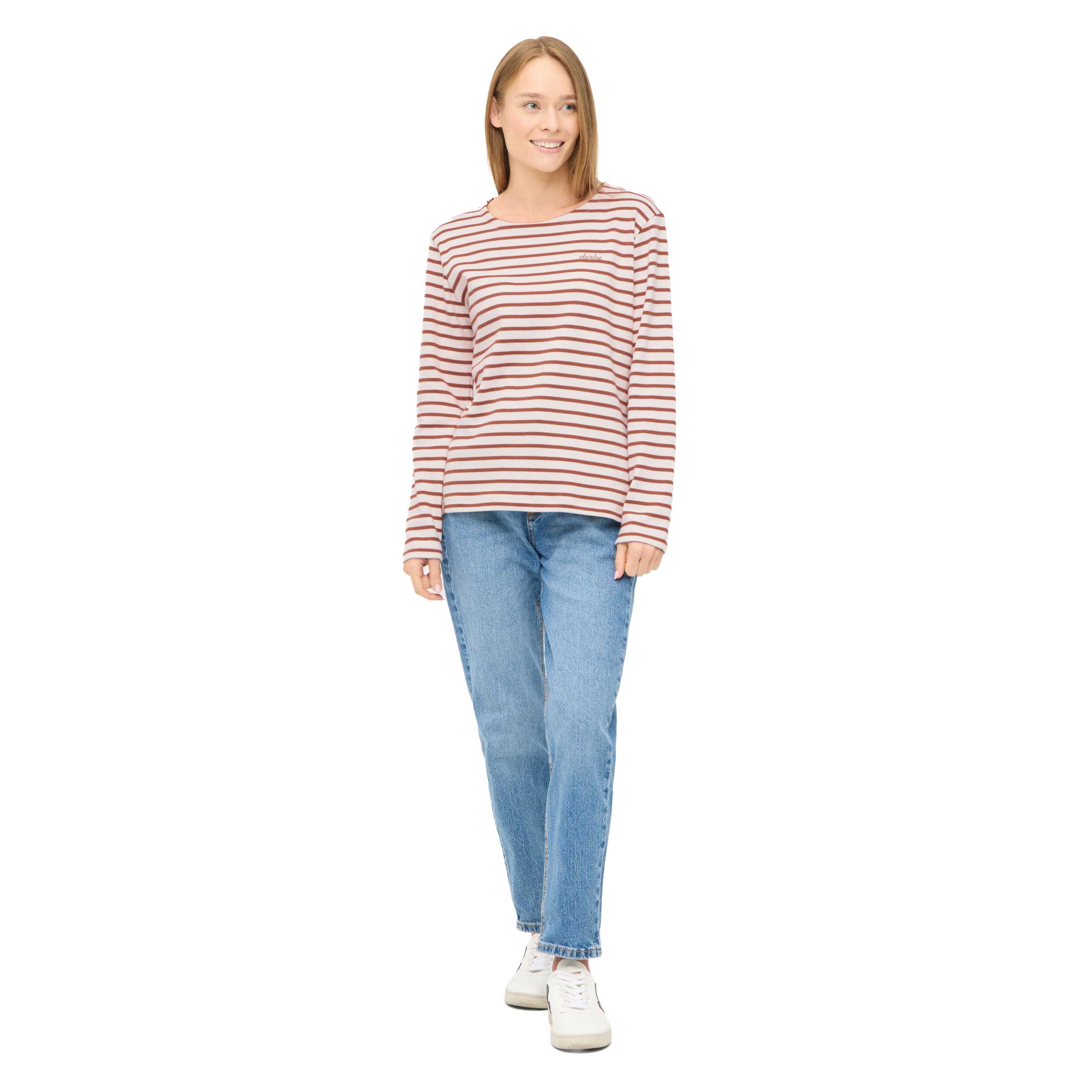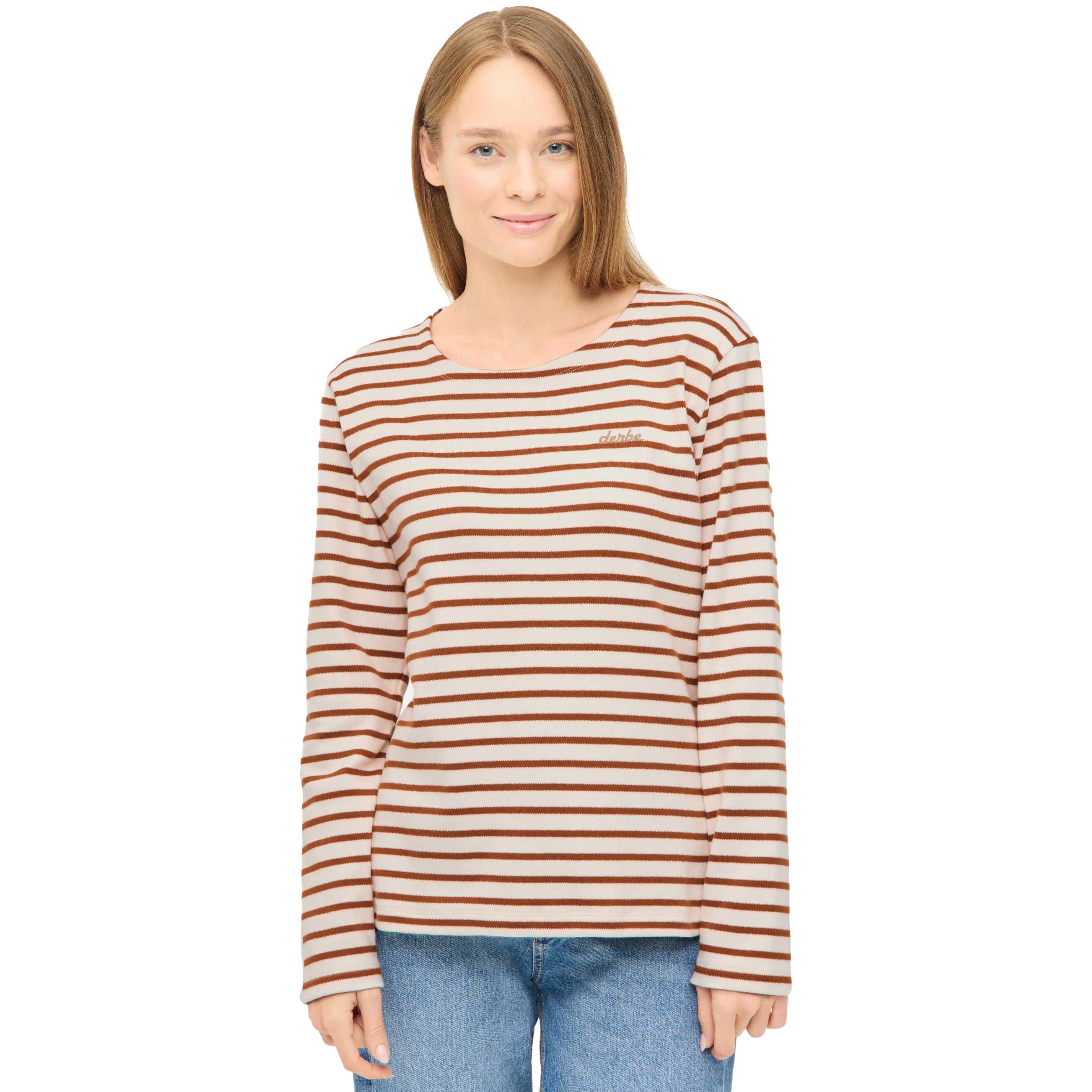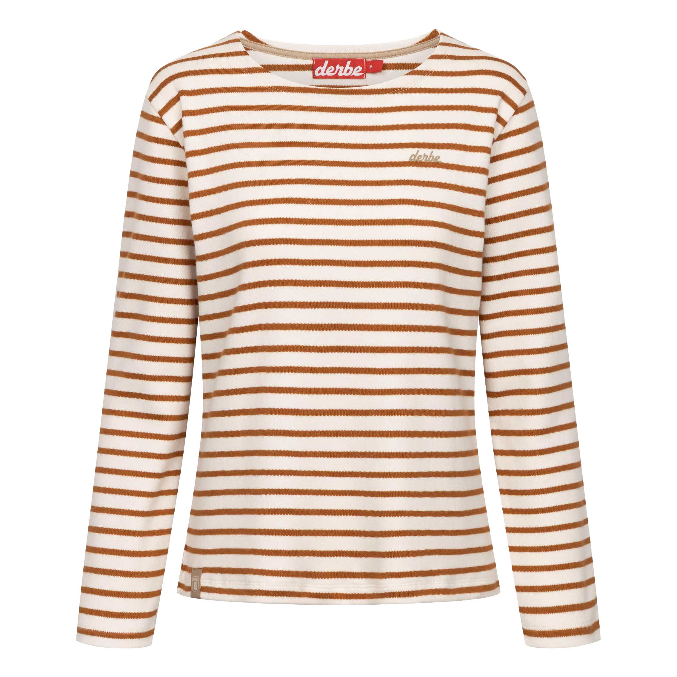 Ahoi, Lieblingsshirt! Dieses caramel & weiße Longsleeve von Derbe bringt den maritimen Look in deinen Alltag. Gefertigt aus hochwertigem Interlock Jersey, ist es nicht nur weich & formstabil, sondern auch elastisch & robust – genau das richtige für gemütliche Tage und frische Brisen.
