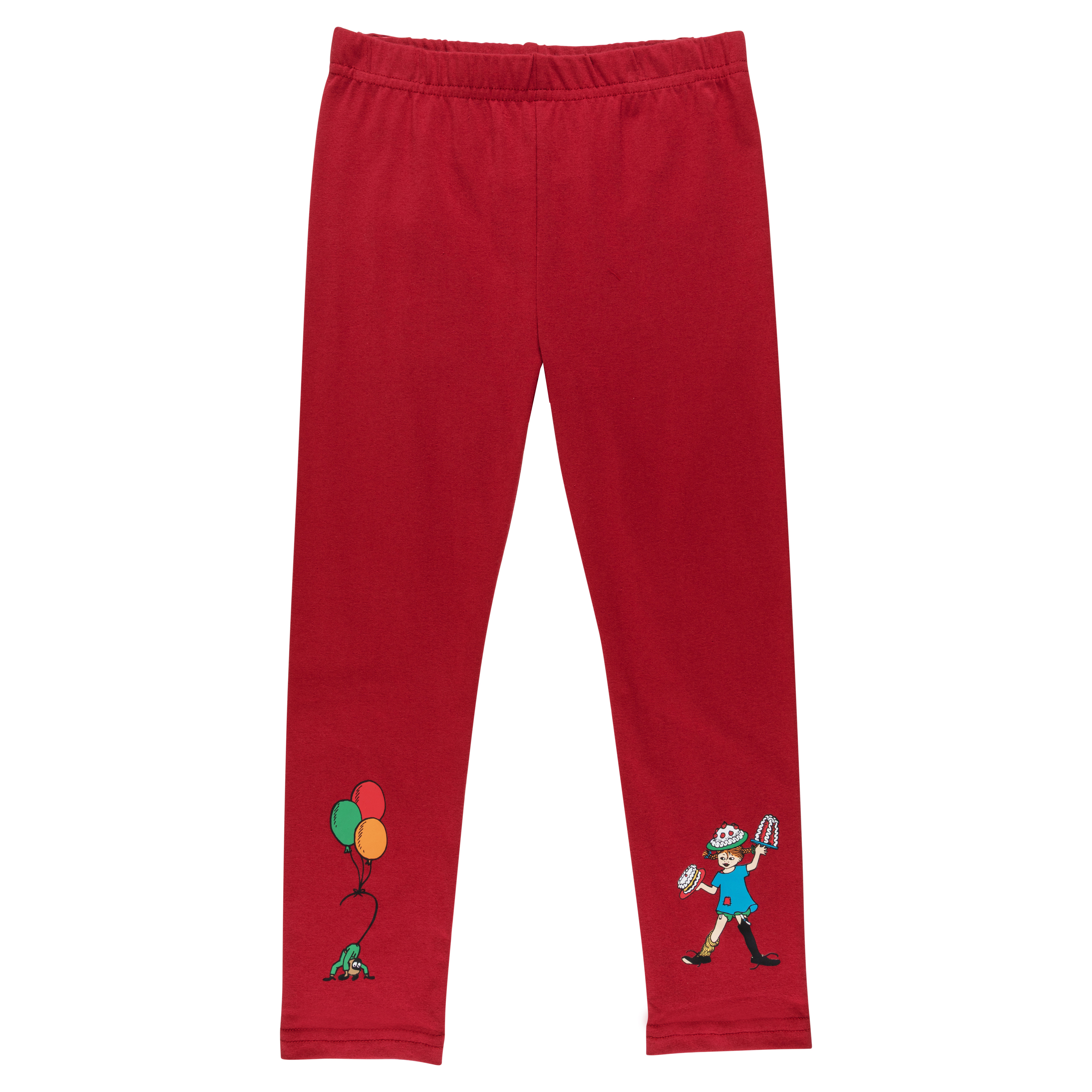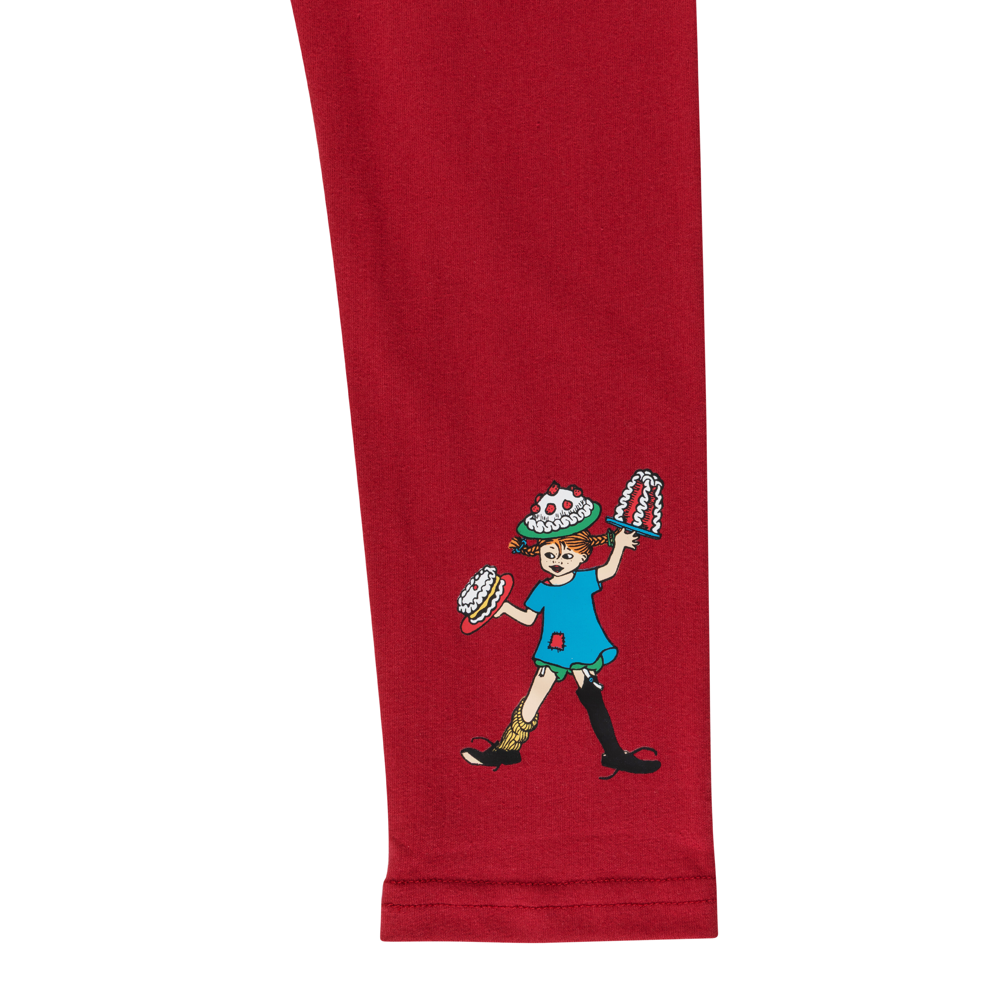 So fröhlich wie Pippi selbst! Diese roten Kinderleggings aus weichem Bio-Baumwolljersey bringen Farbe und gute Laune in den Alltag. Auf beiden Beinen finden sich liebevolle Prints aus Pippis kunterbuntem Geburtstagsfest in der Villa Kunterbunt – mit Kuchen, Ballons und jeder Menge Süßigkeiten.