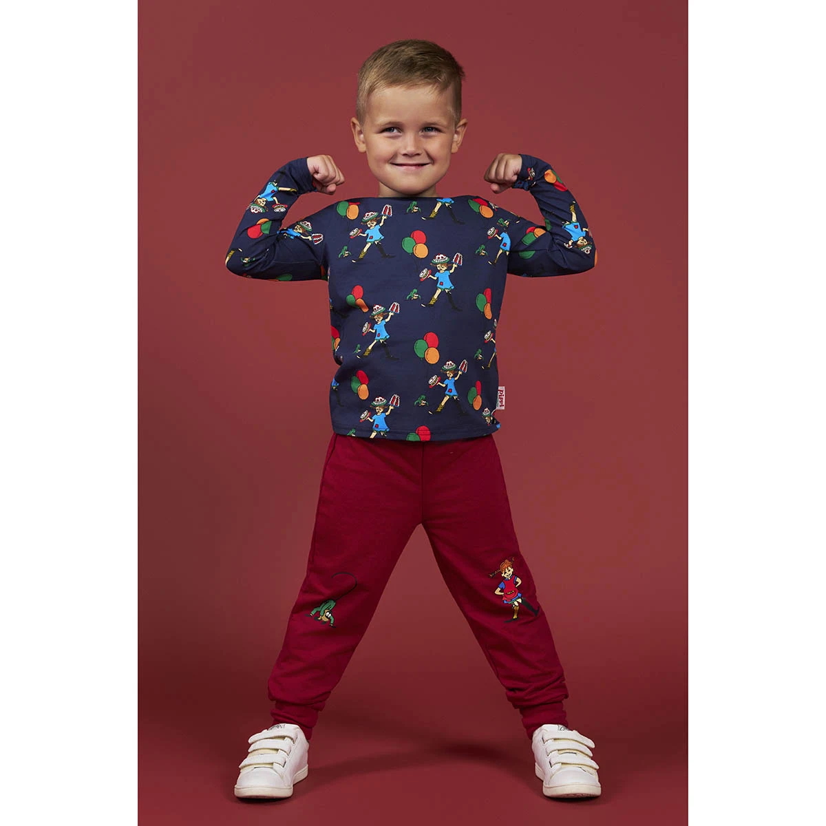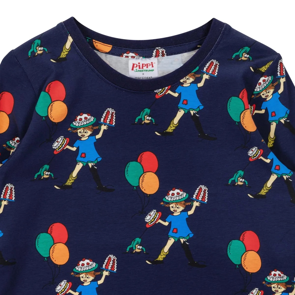 In der Villa Kunterbunt wird gefeiert! Dieses dunkelblaue Langarmshirt aus weichem Bio-Baumwolljersey zeigt Pippi Langstrumpf mitten im Partytrubel – umgeben von Ballons, Kuchen und Süßigkeiten. Wie immer steckt sie voller Ideen und balanciert fröhlich mit Torten, als wäre es das Normalste der Welt.